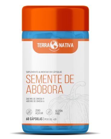 Suplemento natural em cápsulas, fonte de ômega 6 e ômega 9, com ácidos graxos essenciais provenientes da semente de abóbora.